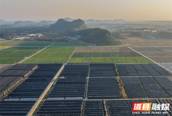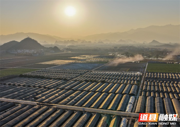 2026年1月11日,道县清塘镇陈熊村,整齐的蔬菜基地、食用菌大棚、成片的高标准农田与村庄、远山相映成景,构成一幅冬日画卷。
