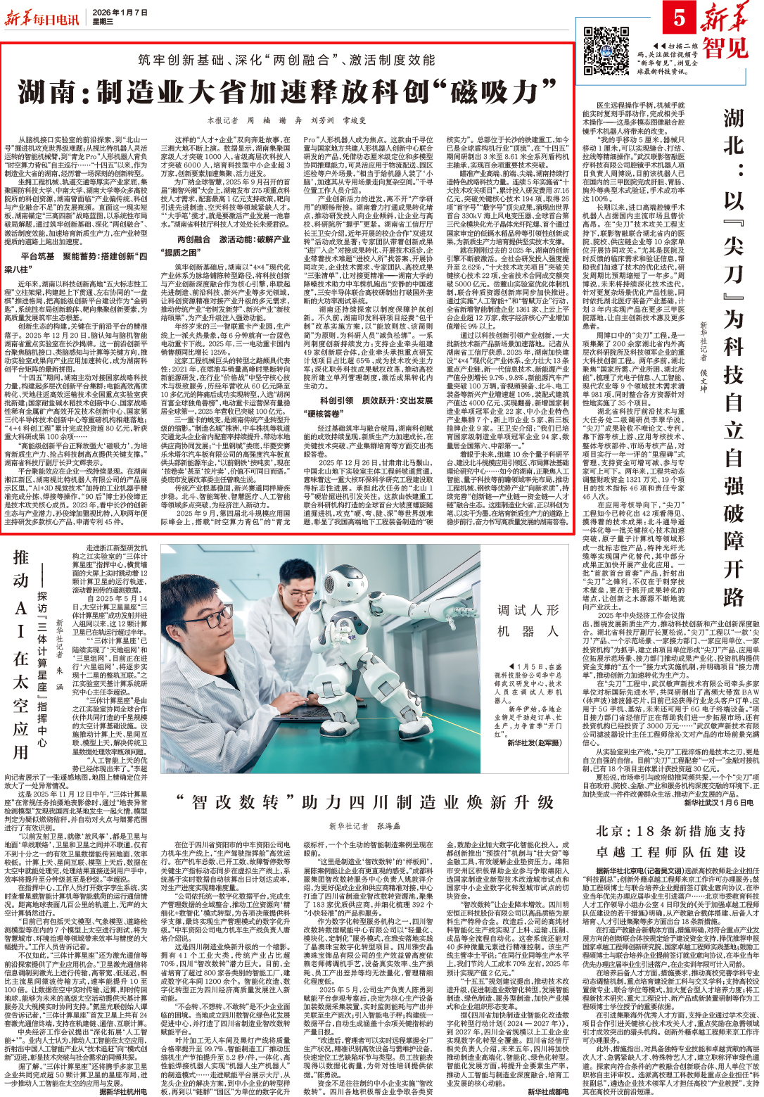 从脑机接口实验室的前沿探索,到“北山一号”掘进机攻克世界级难题;从视比特机器人灵活运转的智能机械臂,到“青龙Pro”人形机器人背负“时空算力背包”自主巡行……“十四五”以来,作为制造业大省的湖南,经历着一场深刻的创新转型。