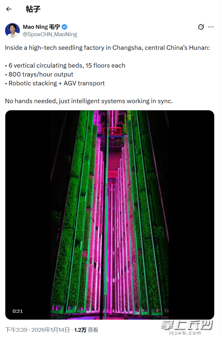 “在中国中部湖南省长沙市的一家高科技育苗工厂内:每小时产出800盘幼苗、机器人堆垛……全程无需人工介入,仅凭智能系统协同作业即可完成。”1月14日,外交部发言人毛宁在社交媒体向全球推介长沙县春华镇的智能化育秧工厂。