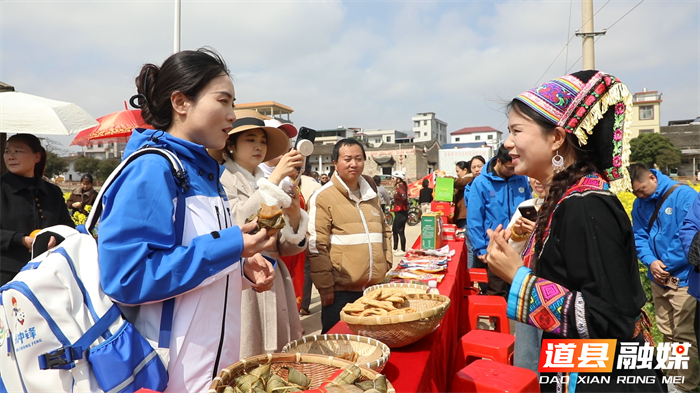 除了赏花、坐船,当地还在周边设了不少美食和特产摊位,不光有道县本地的特色,像道州脐橙、鲊肉、凉粉、炸果子,还有这个季节特产的菜籽油、花蜜和野菜粑粑,不仅让游客的味蕾得到满足,也拓宽了当地农户的增收渠道。
