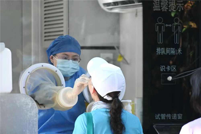 10月2日,核酸采样员在福州市鼓楼区一处采样点为市民服务。(图片来源:新华社)